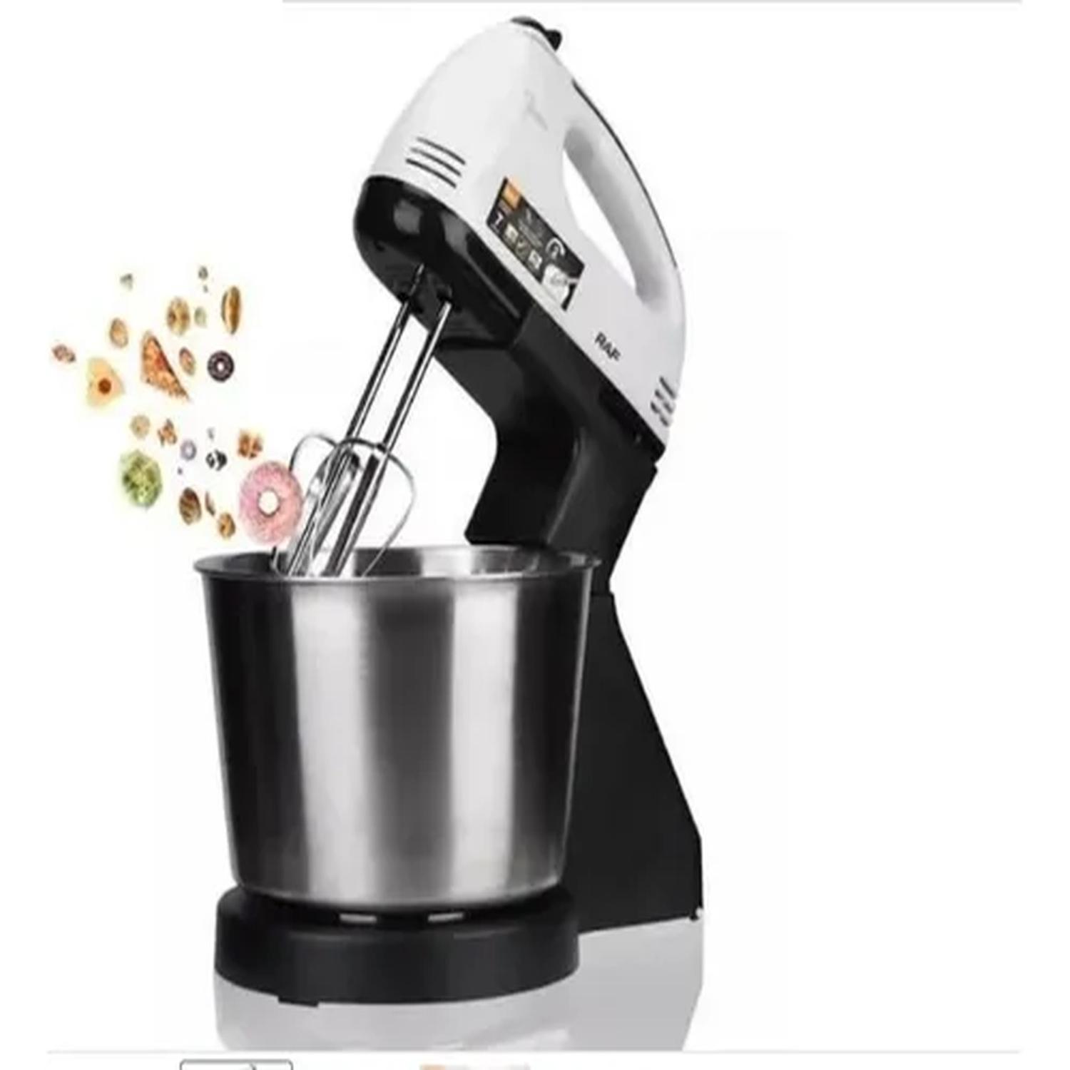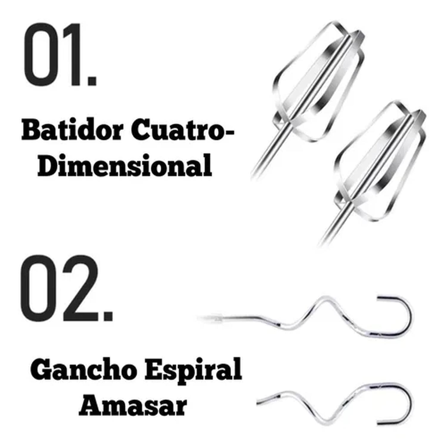Batidora versátil de 250W que funciona tanto manual como con soporte, ideal para mezclar, batir y amasar con resultados profesionales. Incluye cubeta de acero inoxidable de 2L y 4 accesorios para diversas preparaciones culinarias.