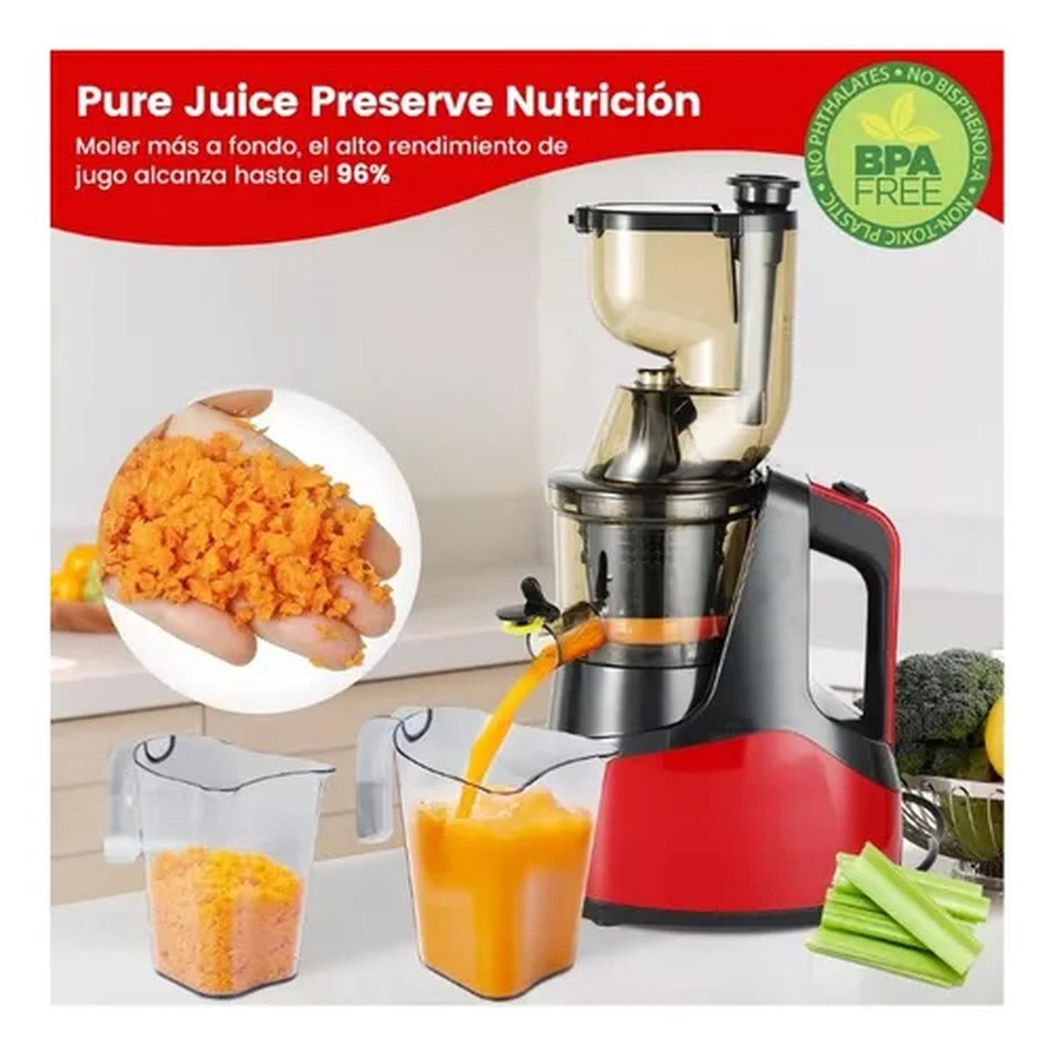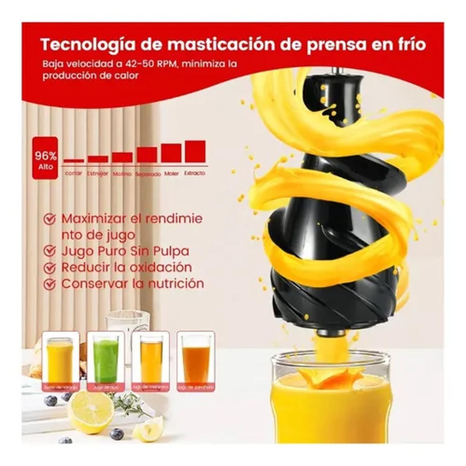 Tecnología de prensado en frío: Extrae hasta un 96% de jugo, manteniendo todos los nutrientes y evitando la oxidación.