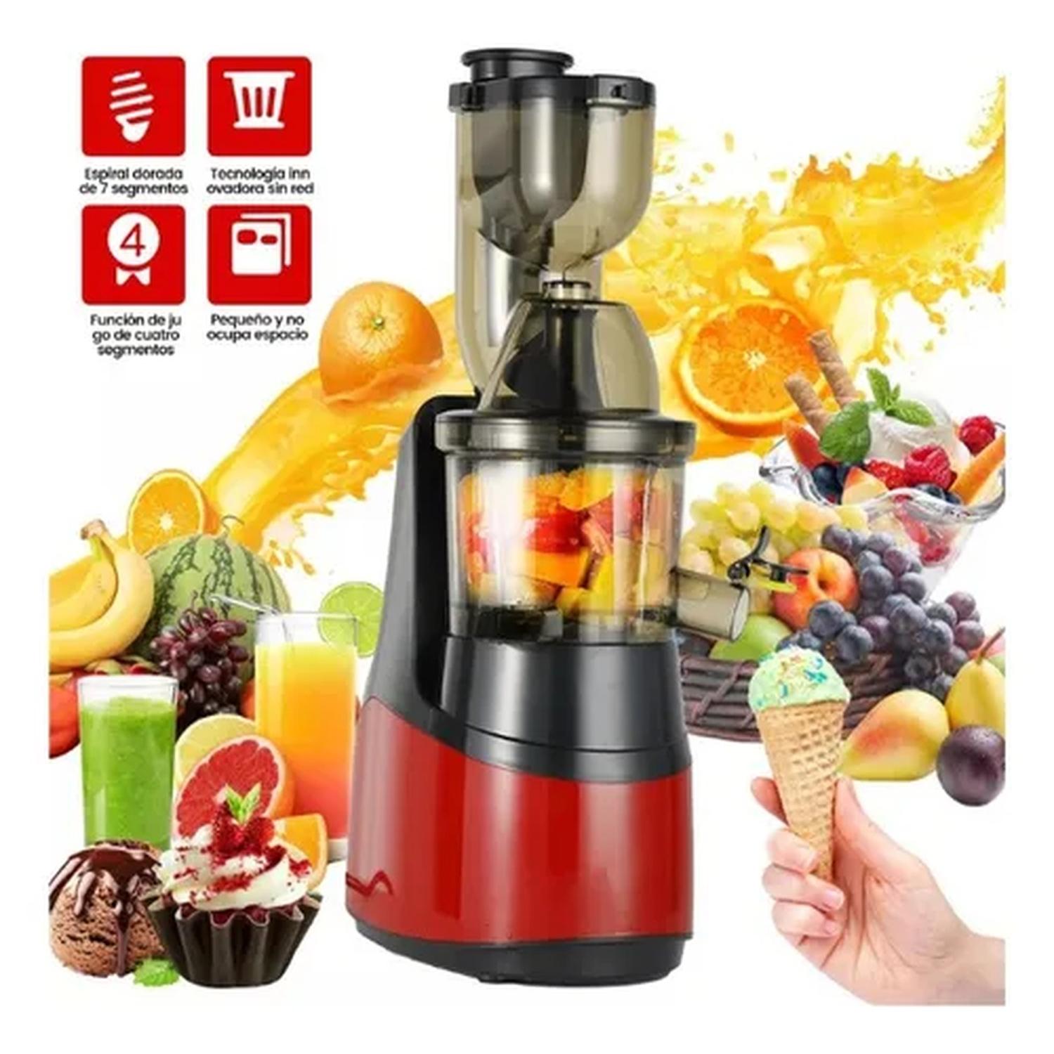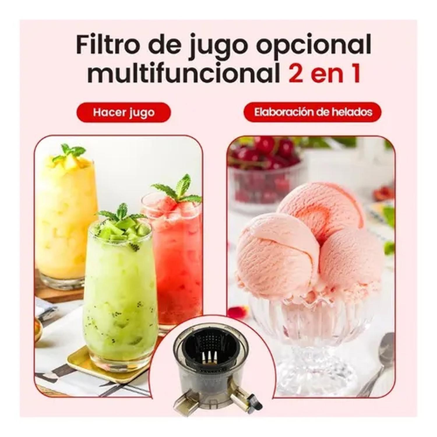 Descubre la manera más sencilla y saludable de disfrutar de jugos frescos y helados naturales con nuestro Exprimidor Multifuncional 2 en 1. Con un innovador sistema de extracción lenta a 50 RPM, este exprimidor de prensa en frío preserva al máximo el color, sabor, vitaminas y nutrientes de frutas, verduras y hojas verdes. Además, no solo te permite preparar jugos, sino también crear deliciosos helados de frutas en casa, sin aditivos y 100% naturales.