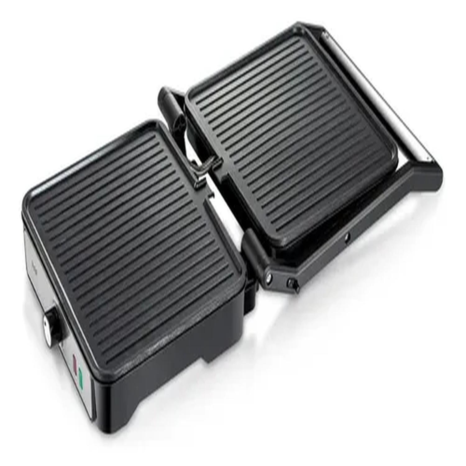 Cocina carnes, verduras y sándwiches de forma rápida y saludable con esta plancha eléctrica de 2000W. Su diseño compacto y funcional incluye apertura de 180°, placas antiadherentes, control automático de temperatura y mango frío al tacto. Fácil de limpiar gracias a sus placas desmontables aptas para lavavajillas.